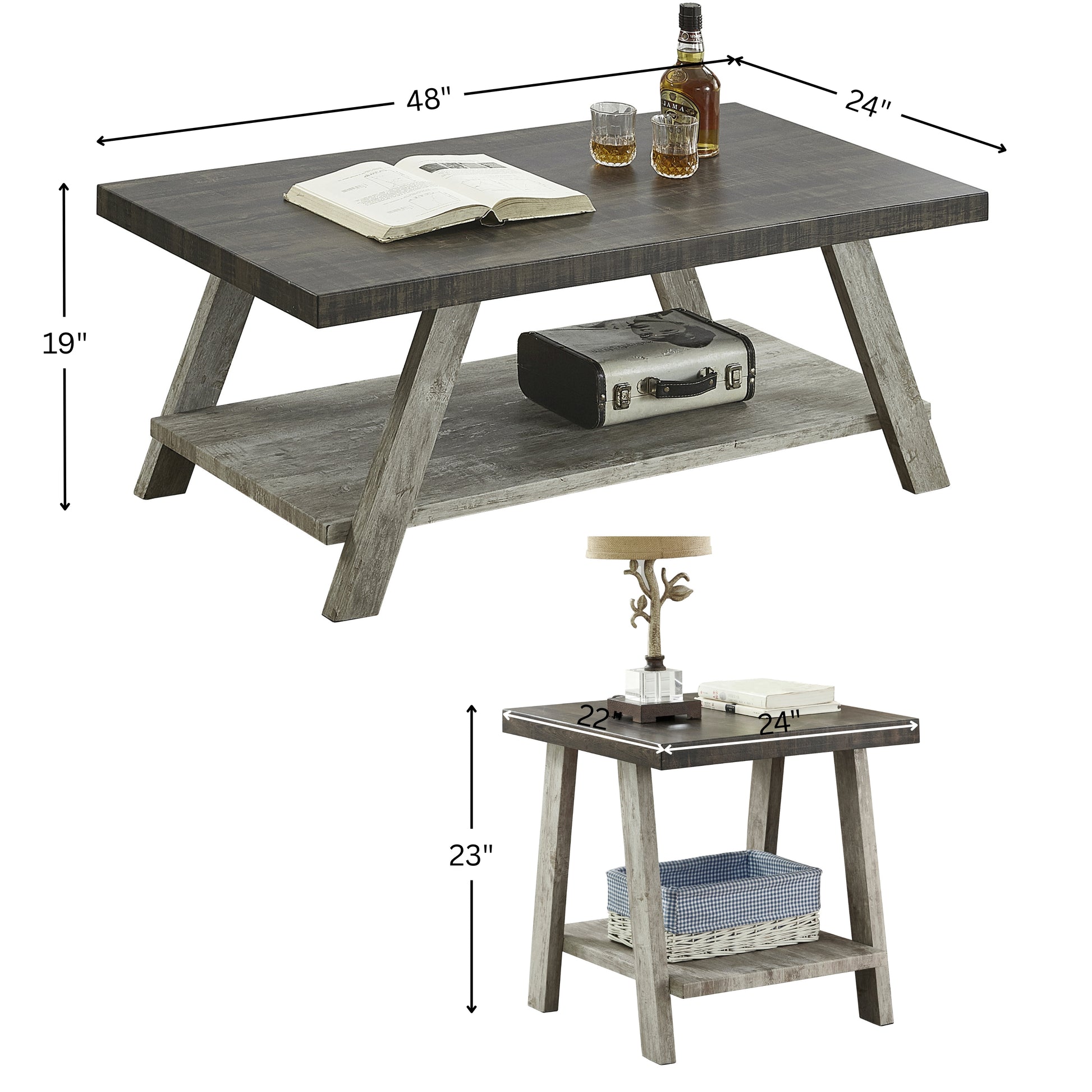 Athens Contemporary 3-Piece Wood Shelf Coffee table'set in Weathered Walnut and Gray